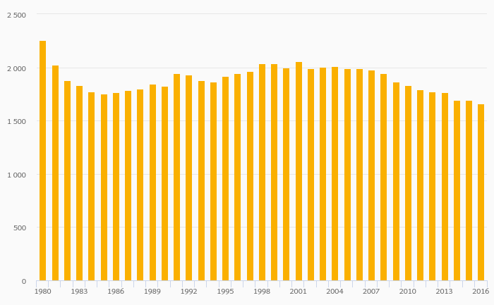 Total Petroleum Consumption fell 2.07% to 1,657 '000 bpd in France in 2016