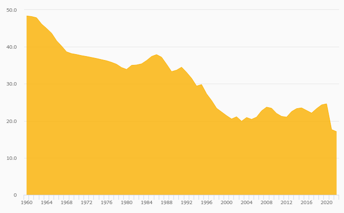 Crude Birth Rate (Per 1,000 People) fell 3.28% to 17.1 births in Uzbekistan in 2022