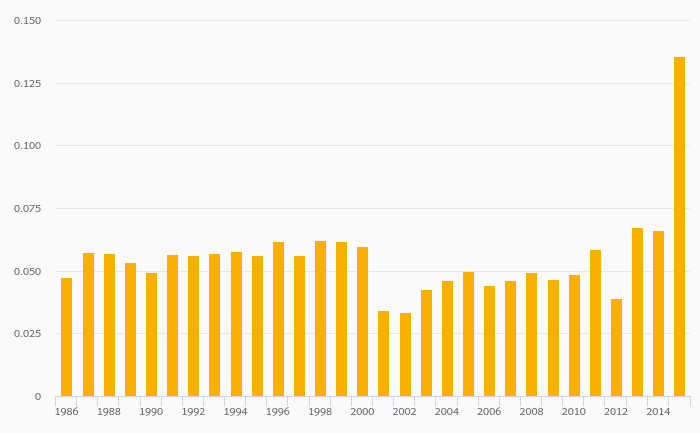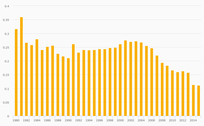 Petroleum Consumption (As % of Worldwide Consumption) fell 1.86% to 0.111% in Puerto Rico in 2015
