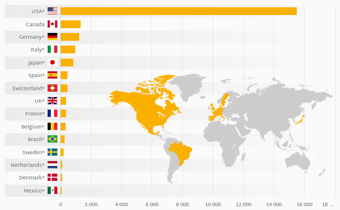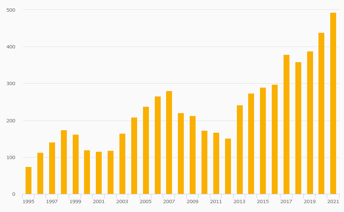 Households' Assets In Investment Funds (USD) rose 12.4% to USD 493 bil in Spain in 2021