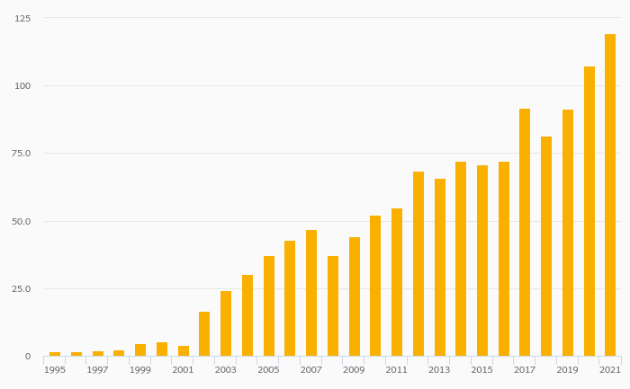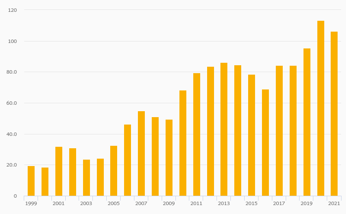 Households' Assets In Investment Funds (USD) rose 11.1% to USD 119 bil in Denmark in 2021