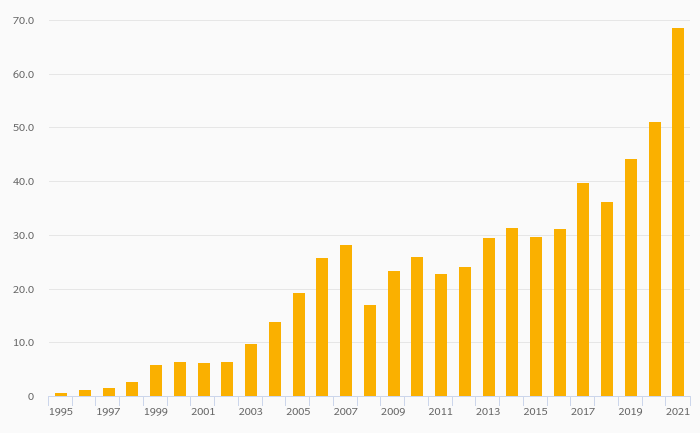 Households' Assets In Investment Funds (USD) rose 34.1% to USD 68.7 bil in Finland in 2021