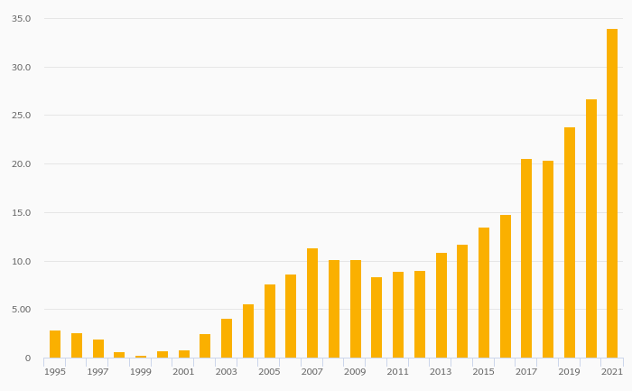 Households' Assets In Investment Funds (USD) rose 27.0% to USD 34.0 bil in Czechia in 2021
