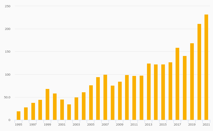 Households' Assets In Investment Funds (USD) rose 9.65% to USD 232 bil in Sweden in 2021