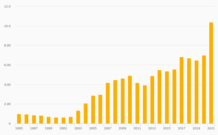 Households' Assets In Investment Funds (USD) rose 48.0% to USD 10.4 bil in Slovakia in 2021