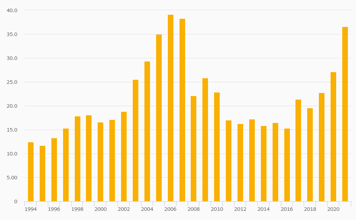 Households' Assets In Investment Funds (USD) rose 35.1% to USD 36.6 bil in Portugal in 2021