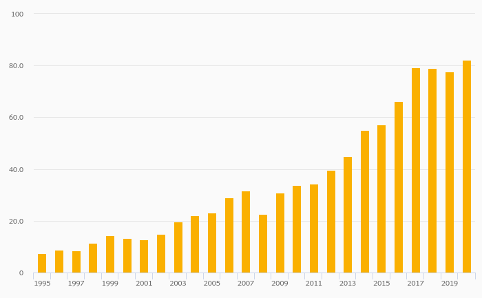 Households' Assets In Investment Funds (USD) rose 5.58% to USD 82.1 bil in New Zealand in 2020