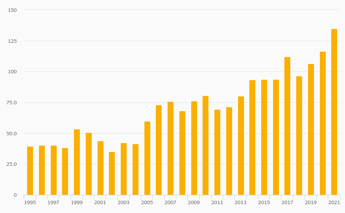 Households' Assets In Investment Funds (USD) rose 15.6% to USD 135 bil in Netherlands in 2021
