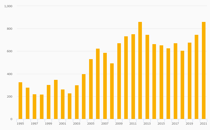 Households' Assets In Investment Funds (USD) rose 15.2% to USD 860 bil in Japan in 2021