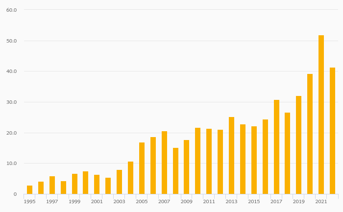 Households' Assets In Investment Funds (USD) fell 20.2% to USD 41.4 bil in Norway in 2022