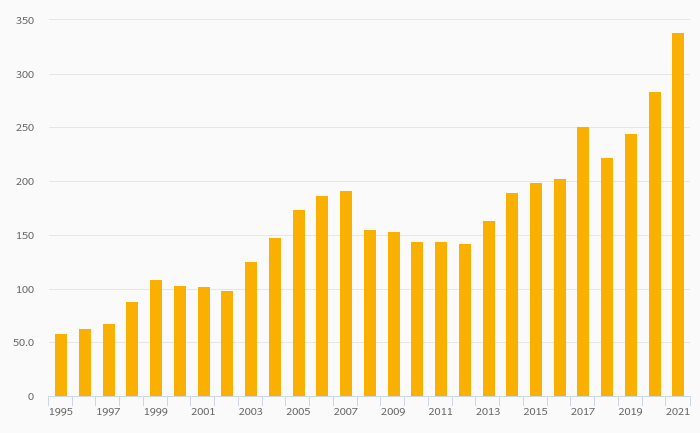 Households' Assets In Investment Funds (USD) rose 19.5% to USD 339 bil in Belgium in 2021