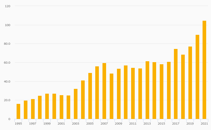Households' Assets In Investment Funds (USD) rose 17.1% to USD 105 bil in Austria in 2021