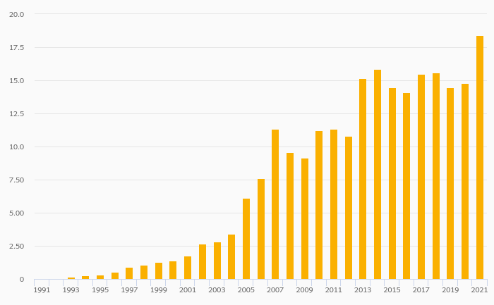 Households' Assets In Investment Funds (USD) rose 24.5% to USD 18.4 bil in Hungary in 2021