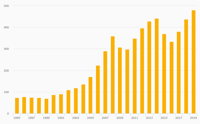 International Tourism, Expenditure (USD) rose 9.59% to USD 480 mil in Moldova in 2019
