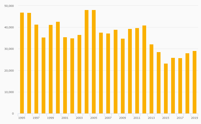 International Tourism, Expenditure (USD) fell 2.38% to USD 41,430 mil in Australia in 2019