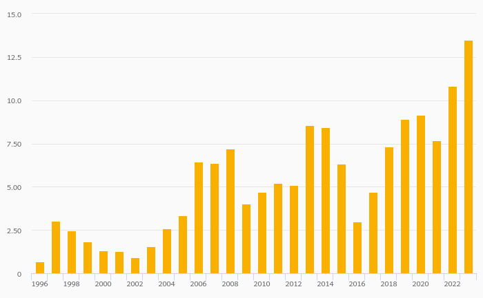 Production of Cars Per 1,000 People rose 25.0% to 13.5 vehicles in Uzbekistan in 2023