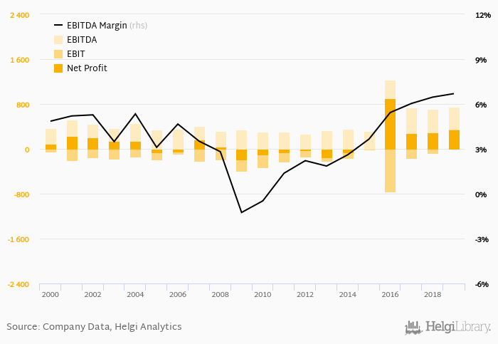 Historically, between 2000 - 2019, the firm’s net profit reached a high of EUR 903 mil in 2016 and a low of EUR -187 mil in 2009. Since 2014, the firm's net profit has increased 626% or % a year on average.