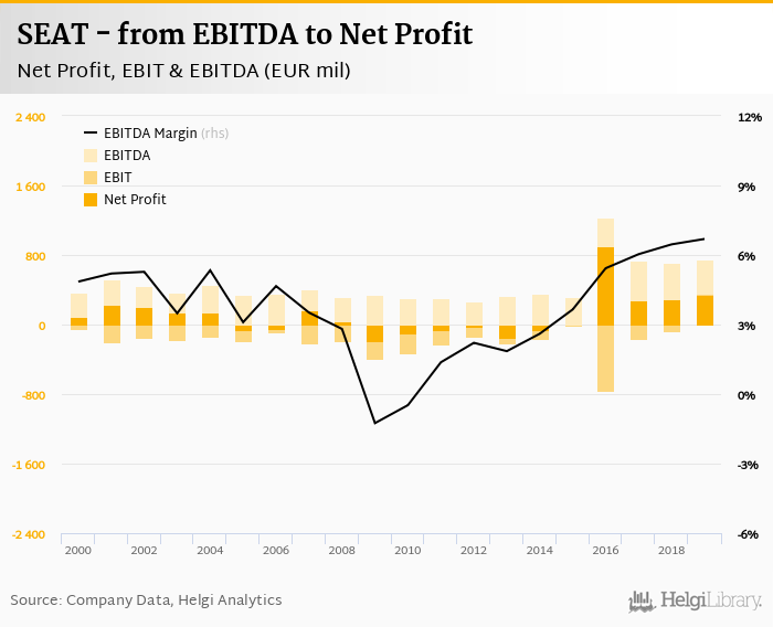 SEAT made a net profit of EUR 346 mil with revenues of EUR 11,157 mil in 2019, up by 17.5% and up by 11.7%, respectively, compared to the previous year. This translates into a net margin of 3.10%.