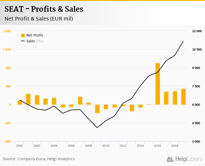 SEAT made a net profit of EUR 346 mil in 2019, up 17.5% compared to the previous year. Total sales reached EUR 11,157 mil, which is up 11.7% when compared to the previous year.