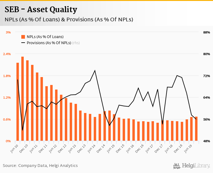 SEB's non-performing loans reached 0.675% of total loans at the end of 2019-09-30, up from 0.543% compared to the previous year. Historically, the NPL ratio hit an all time high of 2.32% in 2010-09-30 and an all time low of 0.508% in 2017-09-30.