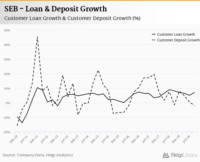 SEB's customer loan growth reached 7.10% in 2019-09-30, down from 8.07% compared to the previous year. Historically, the bank’s loans growth reached an all time high of 10.4% in 2011-12-31 and an all time low of -13.8% in 2011-03-31. In the last decade, the average annual loan growth amounted to 0%.