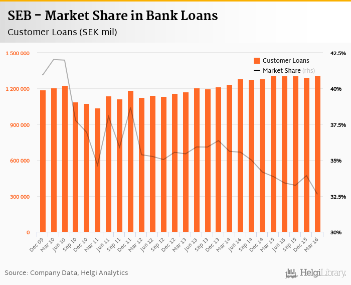 SEB accounted for 32.6% of all customer loans issued in Sweden at the end of 2016-03-31. Historically, the bank’s market share in customer loans reached an all time high of 42.0% in 2010-03-31 and an all time low of 32.6% in 2016-03-31.
