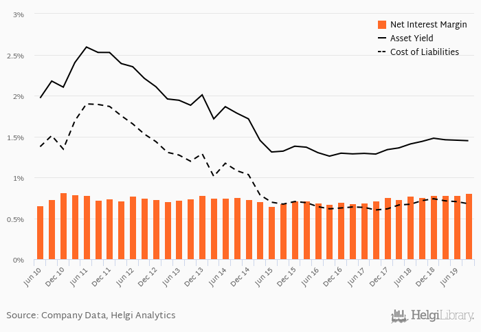 Historically, the bank’s net interest margin reached an all time high of 0.817% in 4Q2010 and an all time low of 0.646% in 2Q2015. The average margin in the last six quarters amounted to 0.780%.
