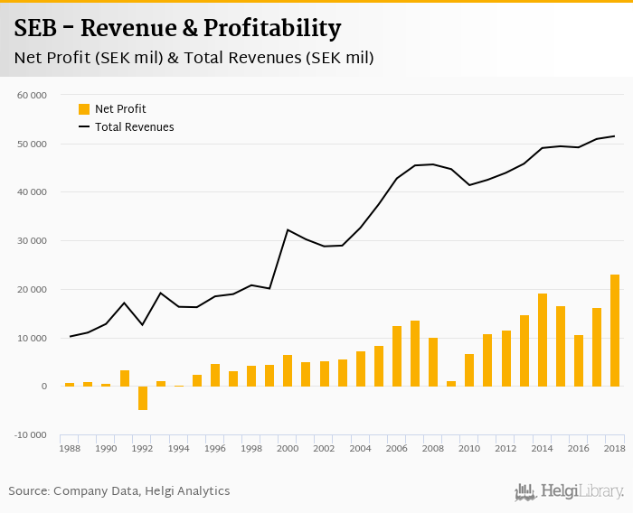 SEB made a net profit of SEK 23,134 mil under revenues of SEK 51,488 mil in 2018, up 42.8% and 1.14% respectively compared to the previous year.
