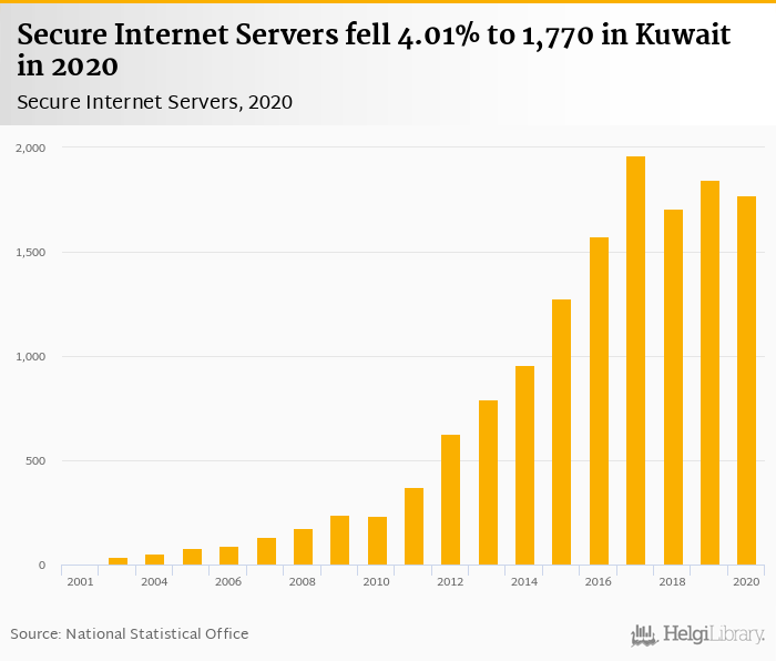 Secure internet servers fell 4.01% to 1,770 in Kuwait in 2020, according to World Bank.