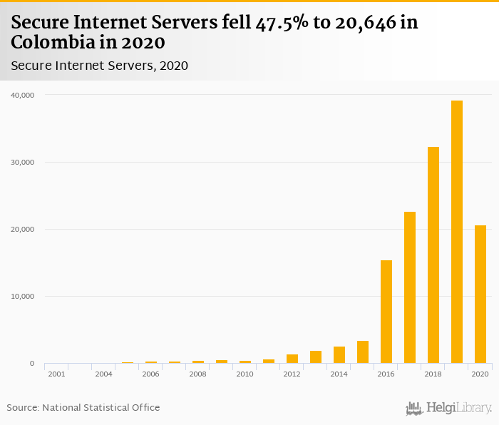 Secure internet servers fell 47.5% to 20,646 in Colombia in 2020, according to World Bank.