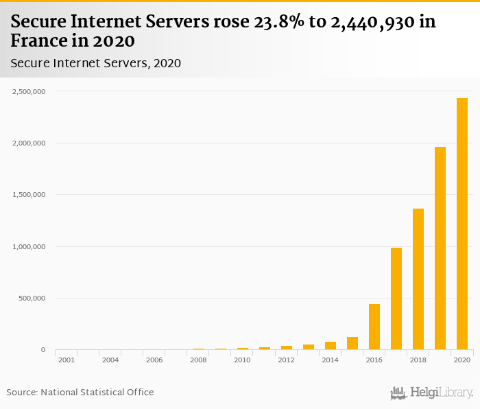 France has been ranked 5th within the group of 177 countries we follow in terms of secure internet servers, 3 places above the position seen 10 years ago.