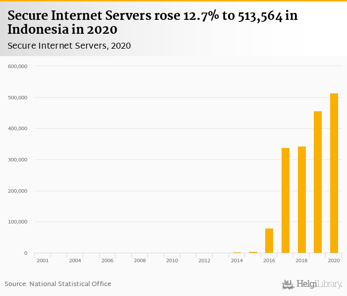 Secure internet servers rose 12.7% to 513,564 in Indonesia in 2020, according to World Bank.