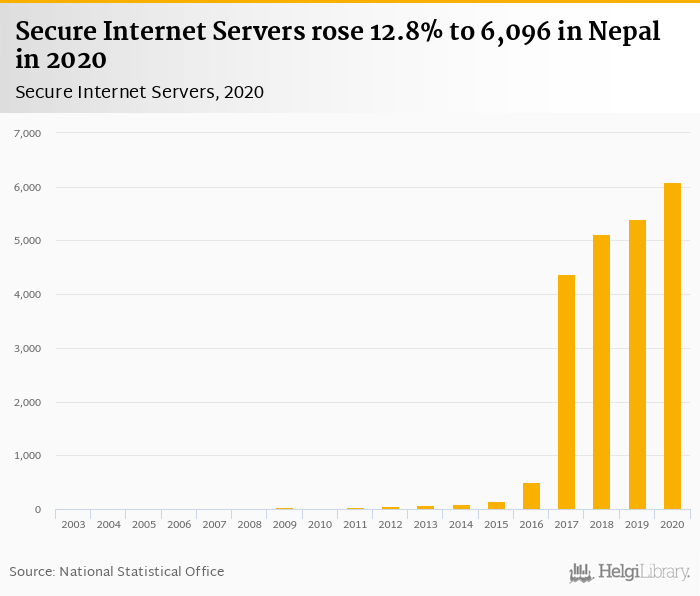 Secure internet servers rose 12.8% to 6,096 in Nepal in 2020, according to World Bank.