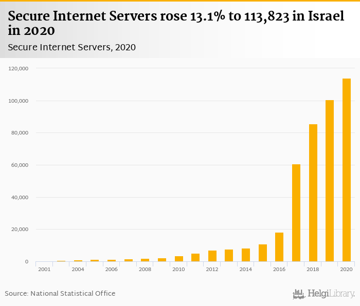 Secure internet servers rose 13.1% to 113,823 in Israel in 2020, according to World Bank.