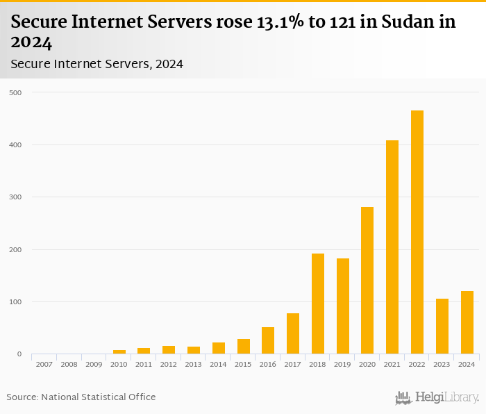 Secure internet servers rose 13.1% to 121 in Sudan in 2024, according to World Bank.