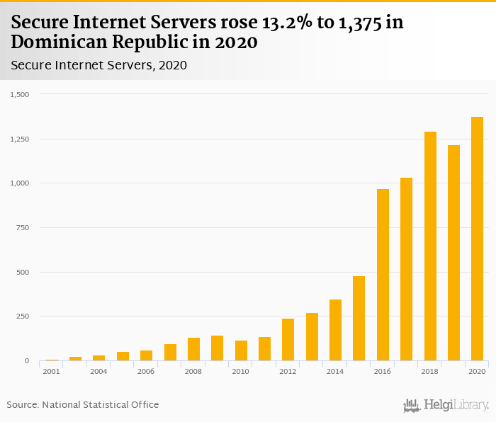 Secure internet servers rose 13.2% to 1,375 in Dominican Republic in 2020, according to World Bank.