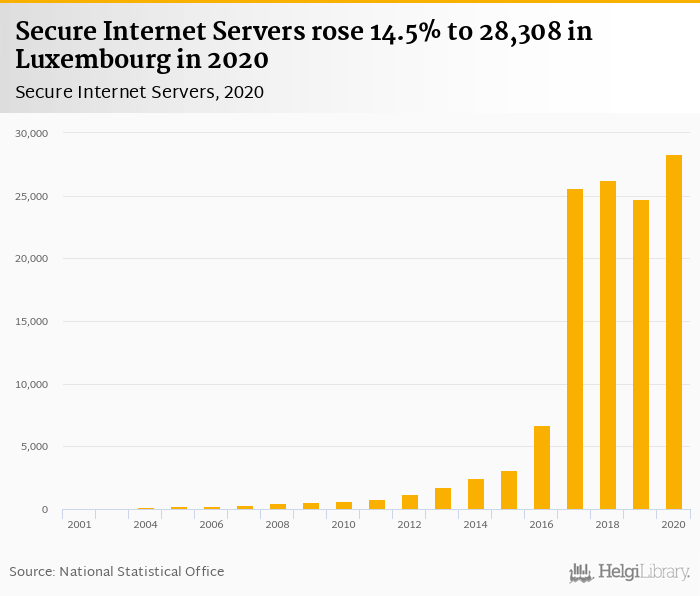 Secure internet servers rose 14.5% to 28,308 in Luxembourg in 2020, according to World Bank.