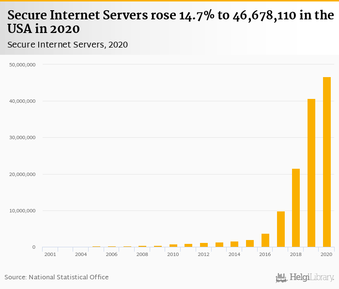 Secure internet servers rose 14.7% to 46,678,110 in the USA in 2020, according to World Bank.
