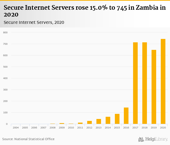 Secure internet servers rose 15.0% to 745 in Zambia in 2020, according to World Bank.