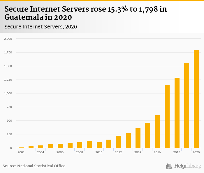 Secure internet servers rose 15.3% to 1,798 in Guatemala in 2020, according to World Bank.