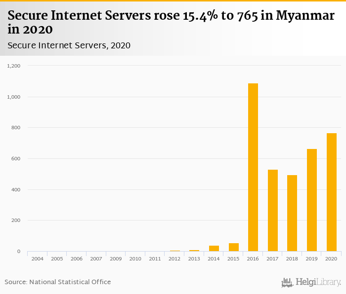 Secure internet servers rose 15.4% to 765 in Myanmar in 2020, according to World Bank.