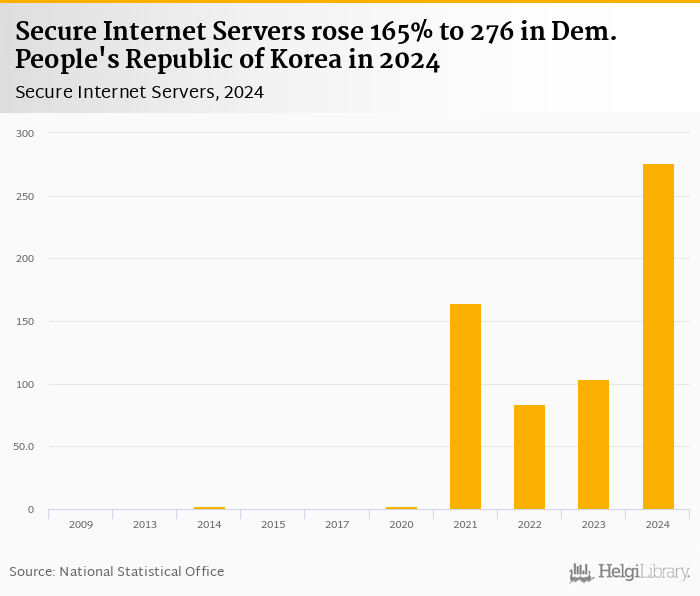 Secure internet servers rose 165% to 276 in Dem. People's Republic of Korea in 2024, according to World Bank.