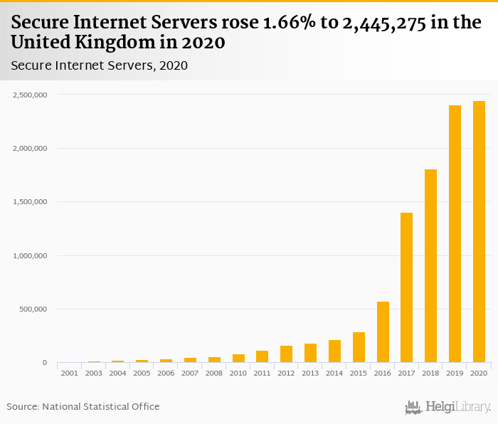 Secure internet servers rose 1.66% to 2,445,275 in the United Kingdom in 2020, according to World Bank.
