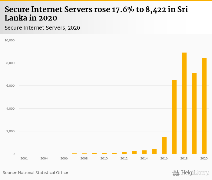Secure internet servers rose 17.6% to 8,422 in Sri Lanka in 2020, according to World Bank.