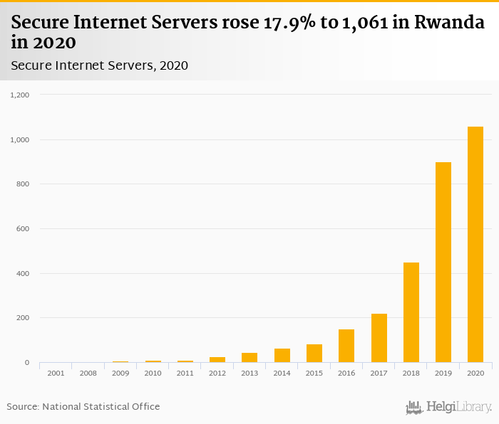 Secure internet servers rose 17.9% to 1,061 in Rwanda in 2020, according to World Bank.