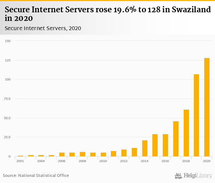 Secure internet servers rose 19.6% to 128 in Swaziland in 2020, according to World Bank.