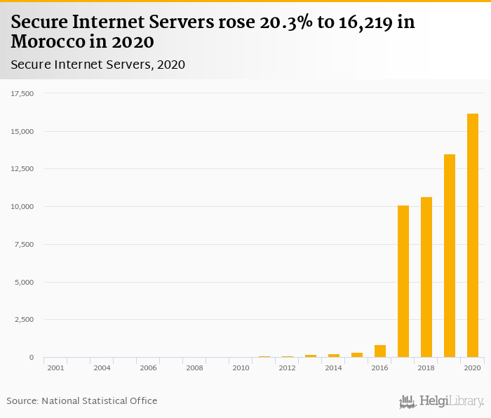 Secure internet servers rose 20.3% to 16,219 in Morocco in 2020, according to World Bank.