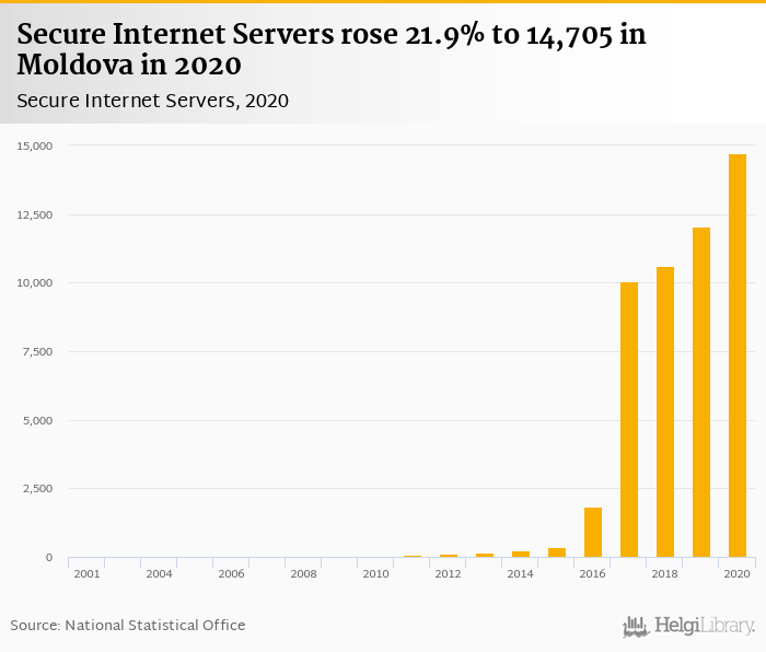 Secure internet servers rose 21.9% to 14,705 in Moldova in 2020, according to World Bank.