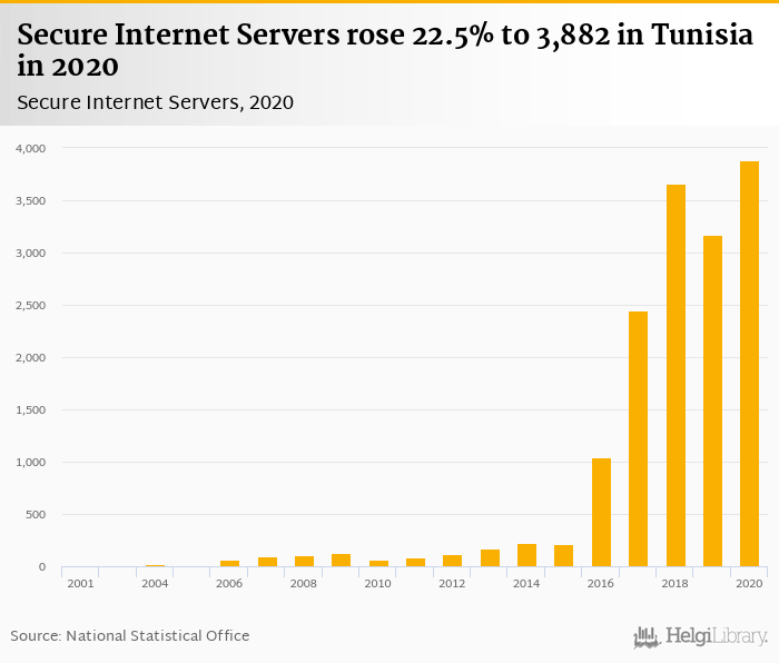 Secure internet servers rose 22.5% to 3,882 in Tunisia in 2020, according to World Bank.