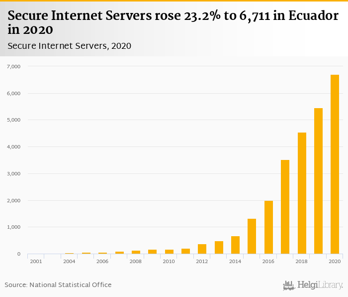 Secure internet servers rose 23.2% to 6,711 in Ecuador in 2020, according to World Bank.